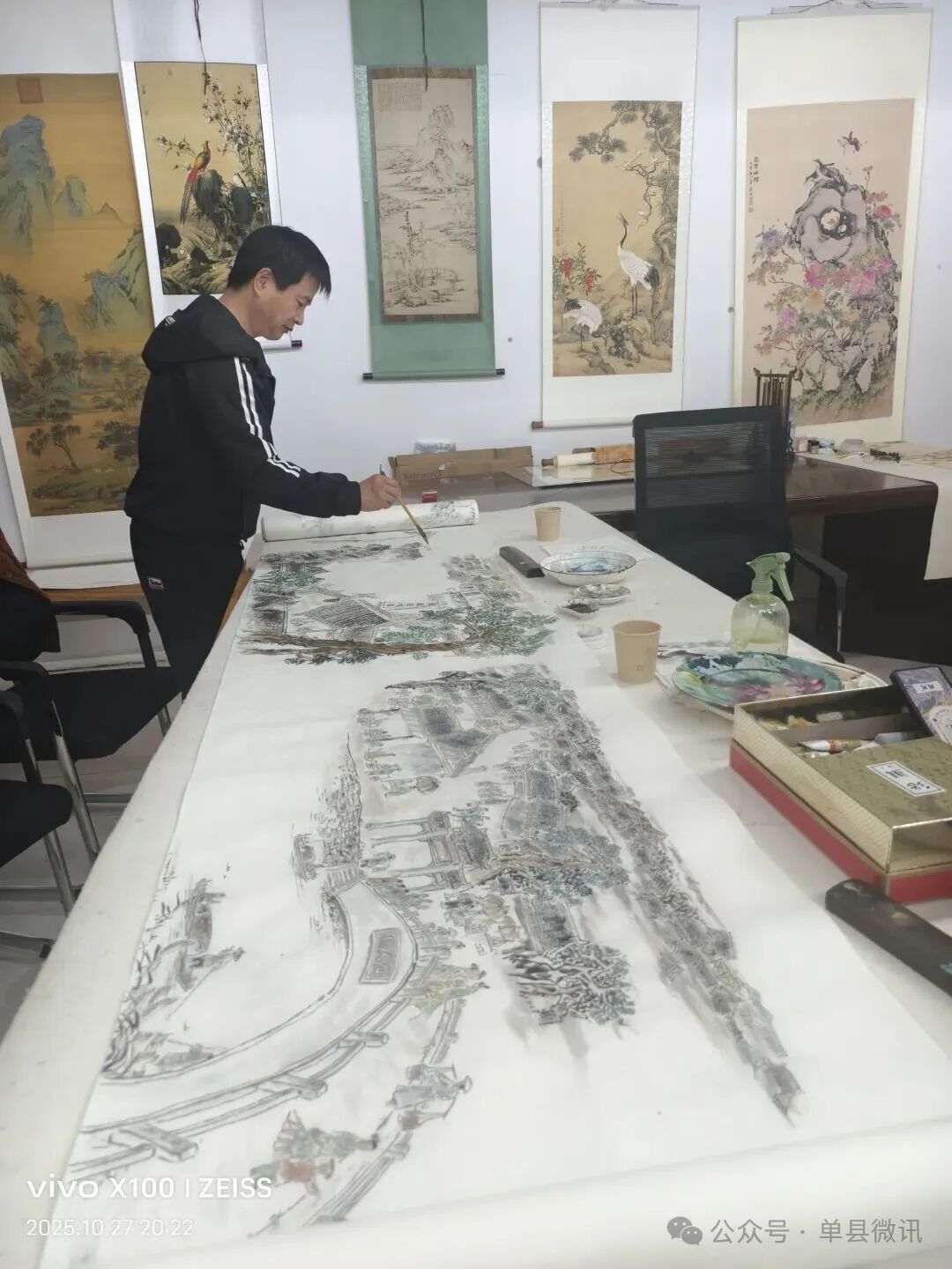 为保障创作质量,单县美术家协会在接到任务后立即成立专项工作组。经过严格筛选,最终抽调叶景刚、沈永革、王继斌等10位在全市享有盛誉的骨干艺术家组成创作团队。这些艺术家各有所长,涵盖山水、人物、工笔等多个领域,确保长卷艺术表现的全面性。