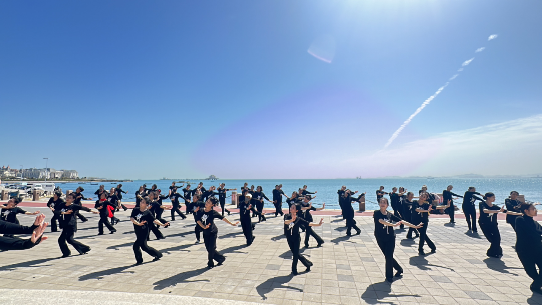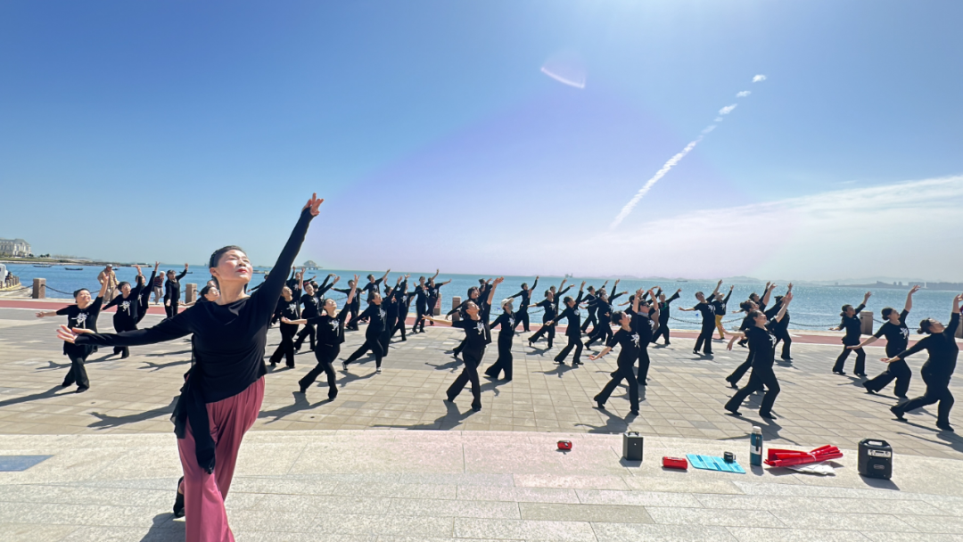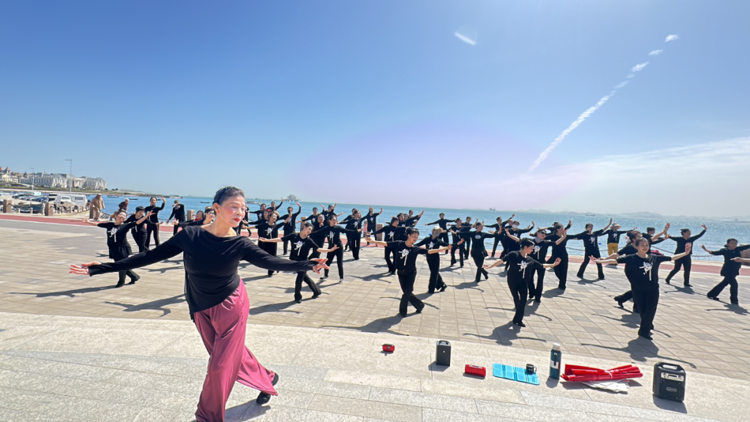 活动现场,身着素色舞衣的市民们自成流动风景。或舒展双臂模拟枝桠生长,或轻快跃动呼应林间鹿影,更有参与者随浪花节拍即兴组合队形。市民刘女士表示,这种打破“舞台表演”压力的自由舞动,让长期伏案的身体重获舒展。活动现场,不少围观游客受热烈氛围感染自发加入,形成独特的“沉浸式艺术共创”场景。