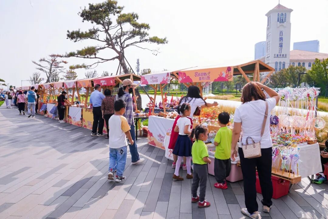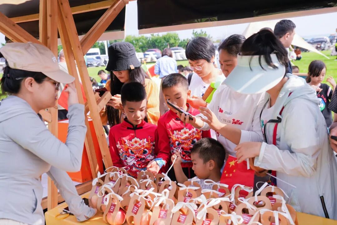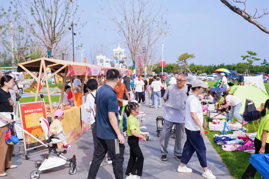 除了精彩纷呈的舞台演出,活动现场还同步设置了非遗、文创、食品、电子产品展销区与互动体验区。烟台剪纸、葫芦彩绘、柳编、非遗糖画、南寨孙氏杠子头等十余个非遗与民俗摊位齐聚一堂,吸引大量市民驻足欣赏、动手体验。非遗传承人现场展示精湛技艺,观众在观看演出的同时,亦可逛市集、玩游戏、品美食、亲手制作工艺品,真正实现了“可看、可玩、可听、可体验”的多重文化享受。户外万平草坪与3000平儿童乐园区全天开放,童话剧花车巡游、儿童创意集市、草地露营、趣味运动会等亲子活动同步开展,不少家庭携老带幼共同参与,现场欢声不断、气氛温馨。