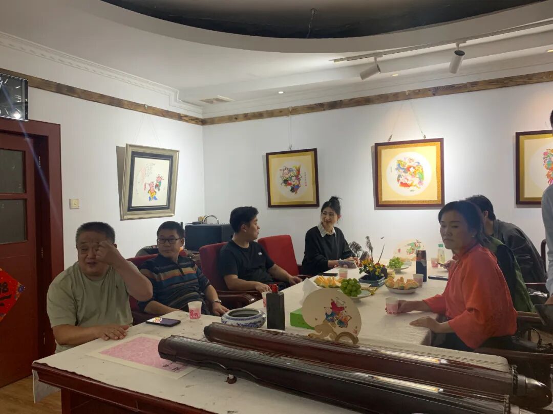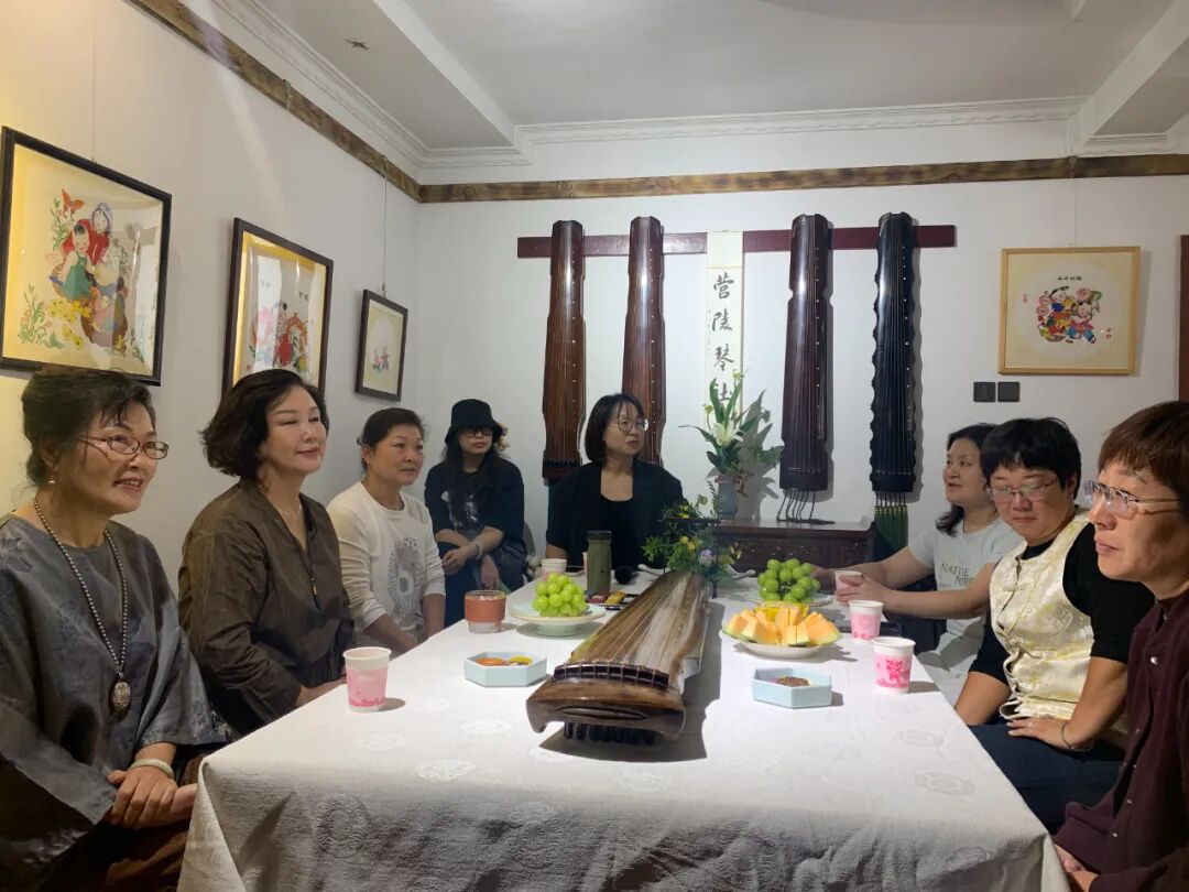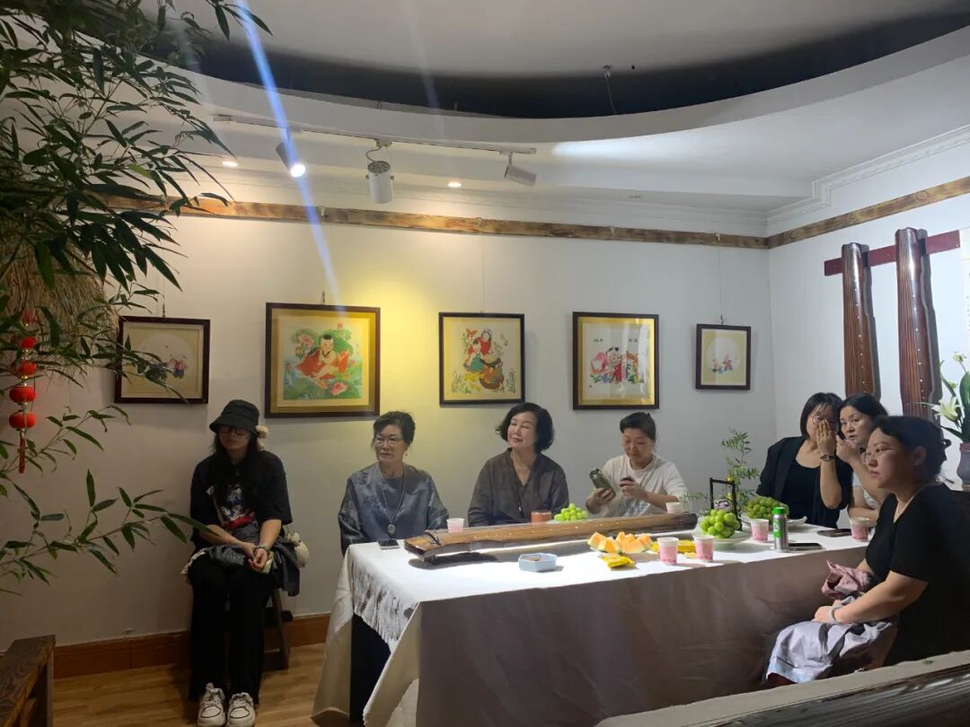 雅集现场,是舌尖与心间的双重盛宴。月饼的甜糯在齿间化开,桂花茶的清香萦绕鼻尖,这既是舌尖上的中秋,更是记忆里挥之不去的团圆滋味。案几之上,皆是东方美学的缩影;昌乐“营陵插花”传承人祝兴强老师的花艺作品,花枝斜倚、花叶相衬,于留白处藏尽含蓄雅致;“烨然农民画”传承人刘国华老师的画作,以浓墨重彩将中秋祝福揉进传统纹样,一笔一画皆是对节日的深情;而“古琴艺术”传承人张家晖老师与诸位琴师奏响的经典琴曲,更如清泉漱石、似月光倾泻,让曼妙琴音成为当晚最动人的告白。