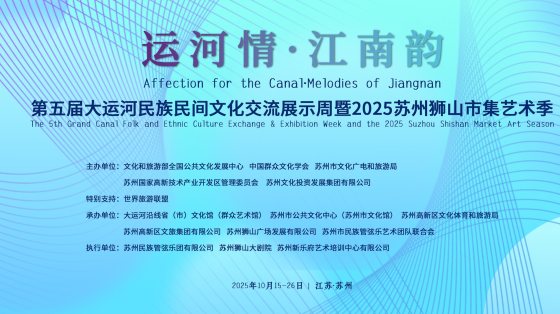为深入贯彻落实习近平文化思想,推动大运河文化带建设与基层公共文化服务深度融合,10月15日至26日,由文化和旅游部全国公共文化发展中心、中国群众文化学会、苏州市文化广电和旅游局、苏州国家高新技术产业开发区管理委员会等共同主办,世界旅游联盟特别支持的“运河情·江南韵”第五届大运河民族民间文化交流展示周暨2025苏州狮山市集艺术季,将在狮山大剧院、狮山广场、苏州市公共文化中心剧院及多个线上平台举行。活动延续运河文化主题,致力于打造一场立足江南、辐射全国、联结中外的群众文化盛会。