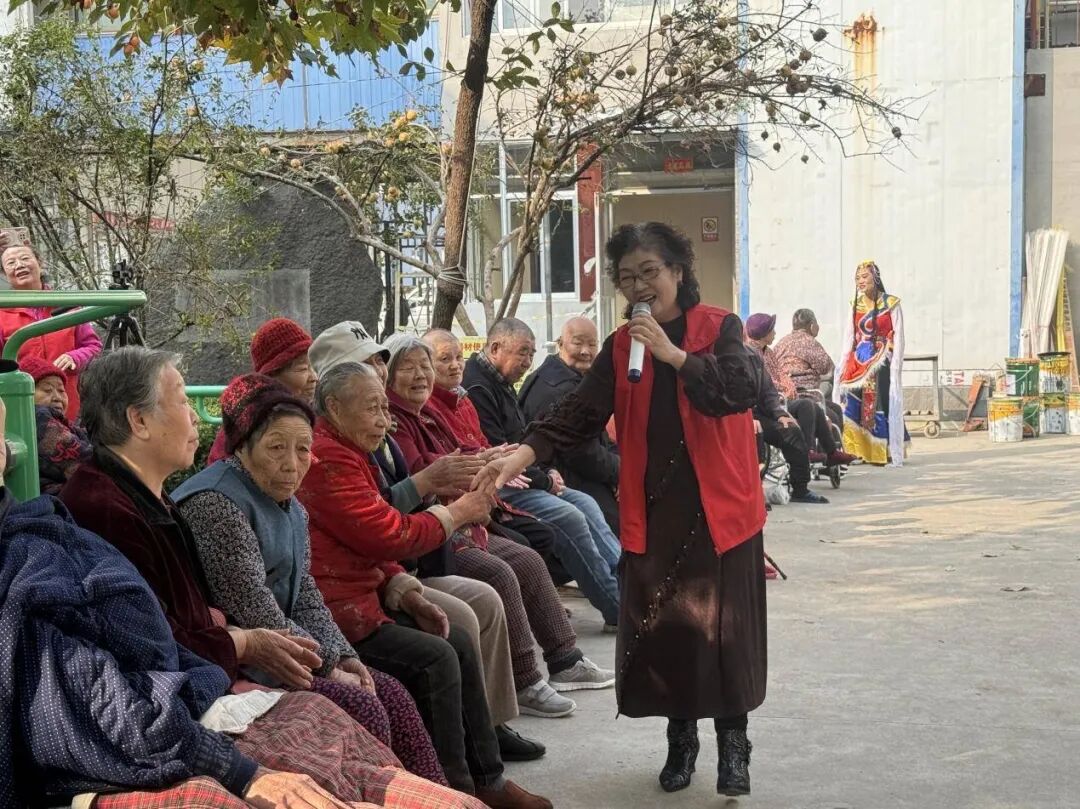 演出现场气氛热烈,老人们围坐在一起,脸上洋溢着期待的笑容。志愿者们精心准备了戏曲、歌舞等精彩节目。经典的戏曲唱段仿佛时光机,带着老人们回到往昔岁月,勾起他们的美好回忆;欢快的歌舞旋律则像欢快的音符,瞬间带动起现场的气氛。老人们看得津津有味,时而随着节奏轻轻鼓掌,时而开怀大笑,幸福的笑容在他们脸上绽放。他们的每一次掌声,都是对志愿者们表演的认可与喜爱,而这也让志愿者们更有动力,用热情的表演传递着温暖与关爱。