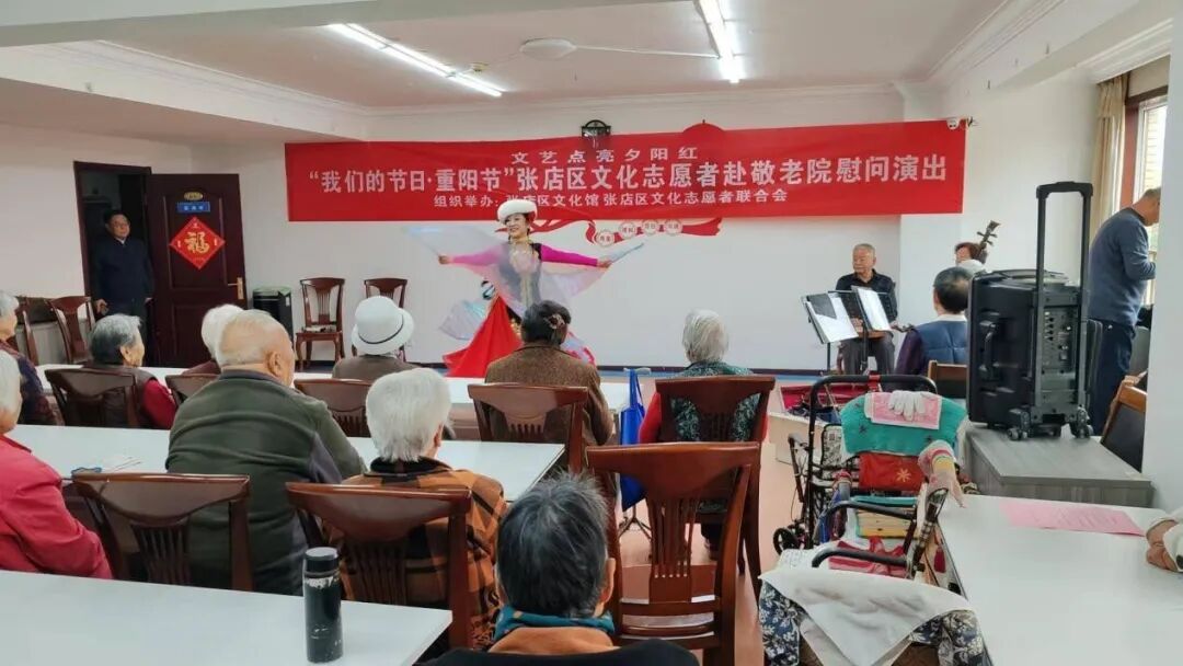 为了让老人们度过一个欢乐祥和的重阳节,张店区文化馆组织张店区文化志愿者联合会文艺小分队走进世纪花园社区、石村老年公寓、王舍夕阳正红老年公寓和湖田街道夕阳红老年公寓,开展了 “我们的节日・重阳节” 张店区文化志愿者赴敬老院慰问演出活动。