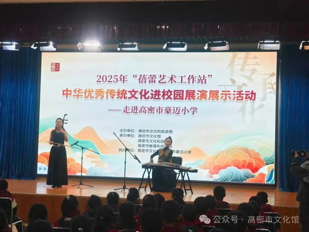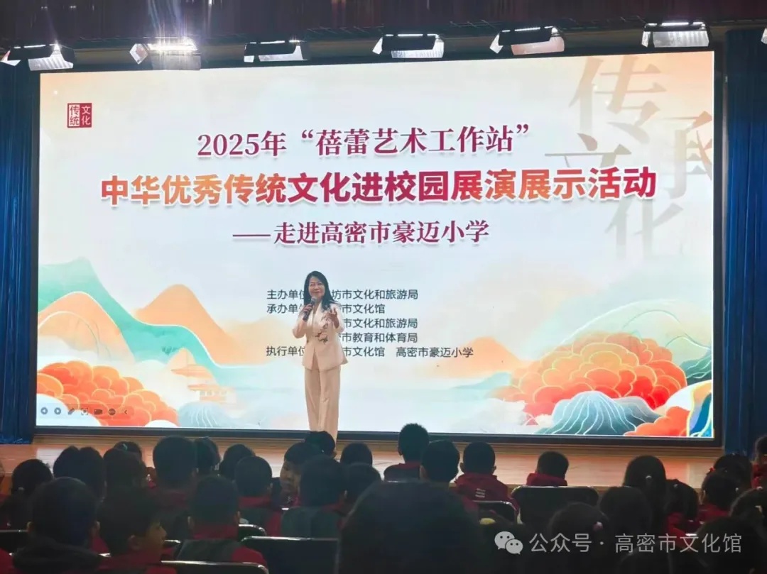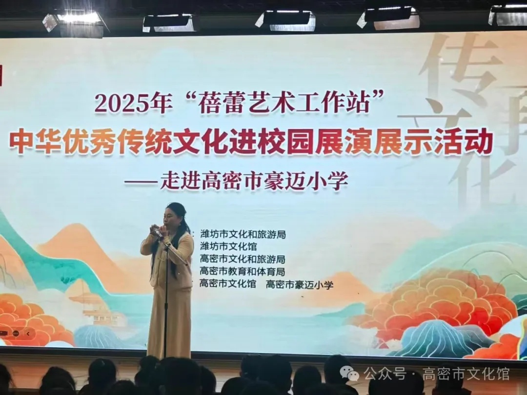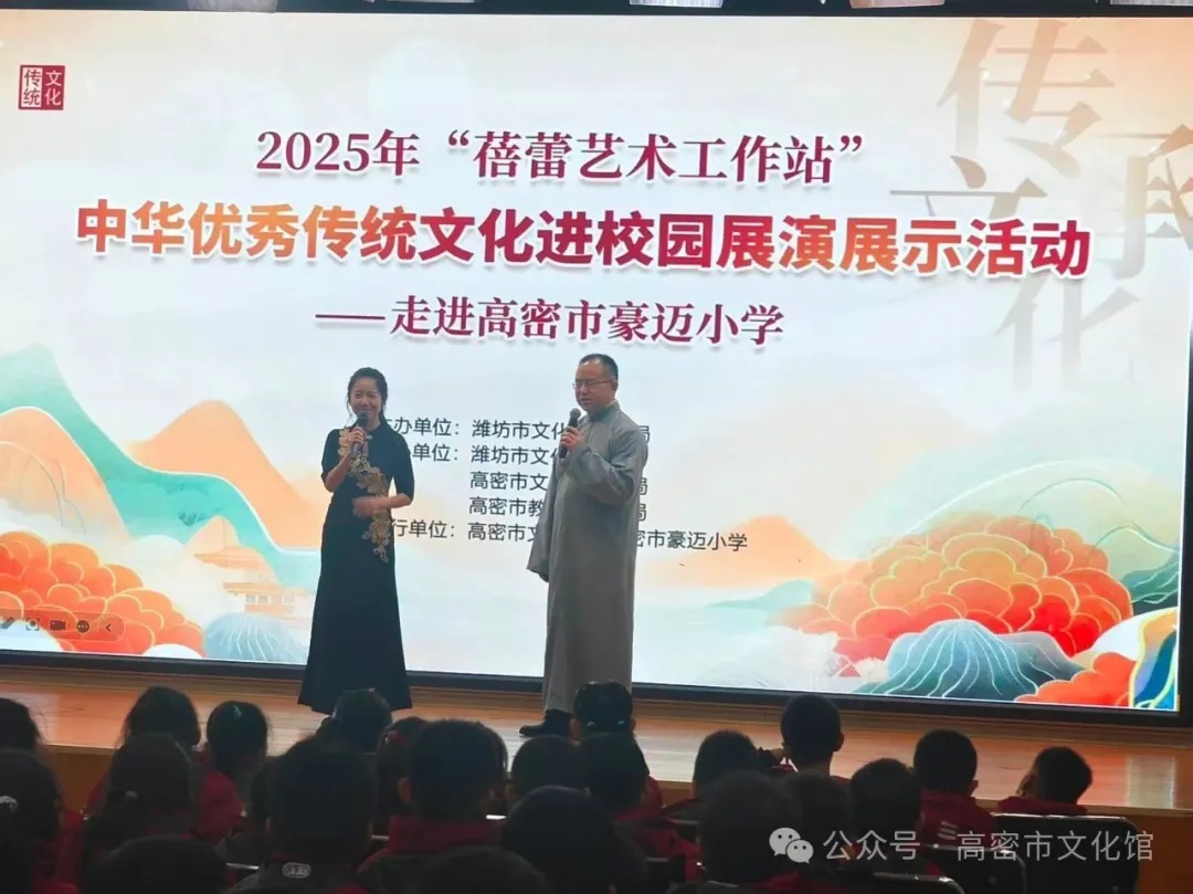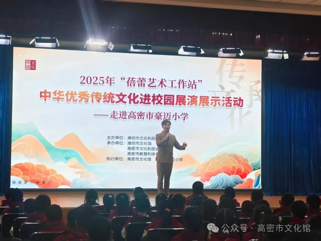近日,潍坊市中华优秀传统文化进校园系列活动高密站在高密市豪迈小学圆满落幕。本次活动由潍坊市文化和旅游局主办,潍坊市文化馆、高密市文化和旅游局、高密市教育和体育局承办,高密市文化馆与高密市豪迈小学联合实施,以“传统文化进校园 蓓蕾朵朵向阳开”为核心,为全校师生带来了一场兼具观赏性与感染力的文化艺术盛宴。齐鲁文化(潍坊)生态保护区服务中心文艺培训部主任付根、高密市文化和旅游局党委委员、副局长宫晓剑、高密市豪迈小学校长孔林等领导出席活动,与师生们共同见证传统文化的魅力绽放。