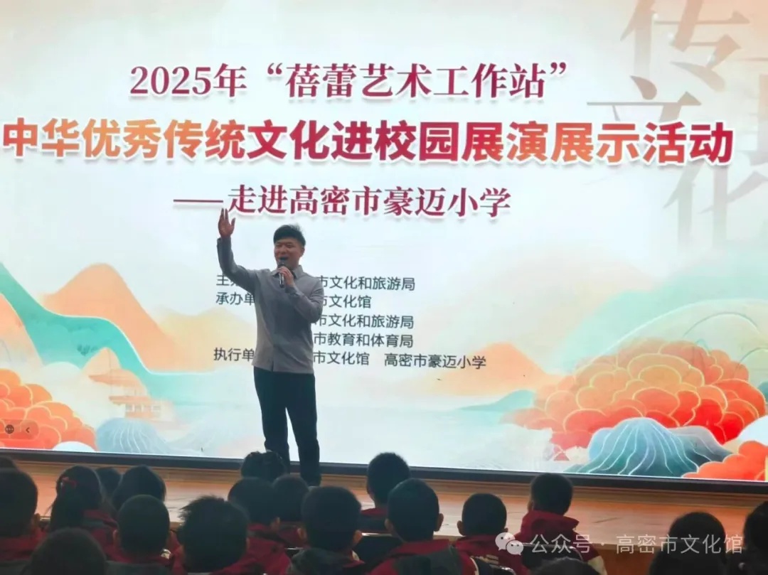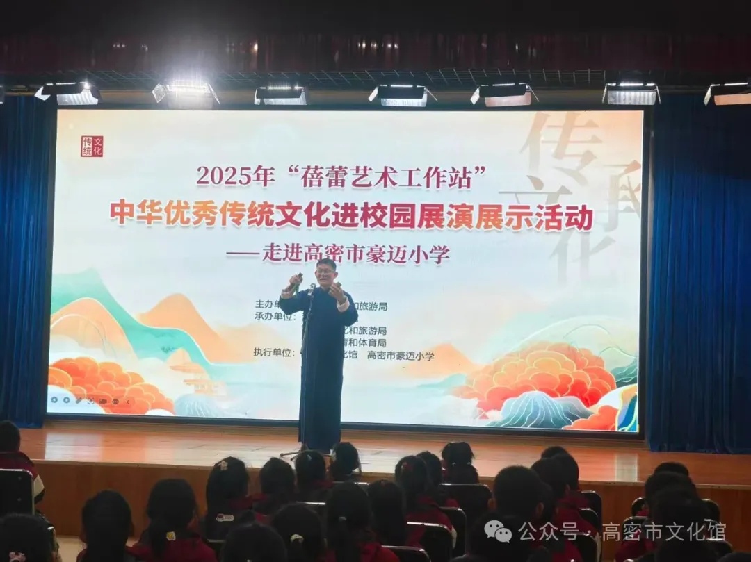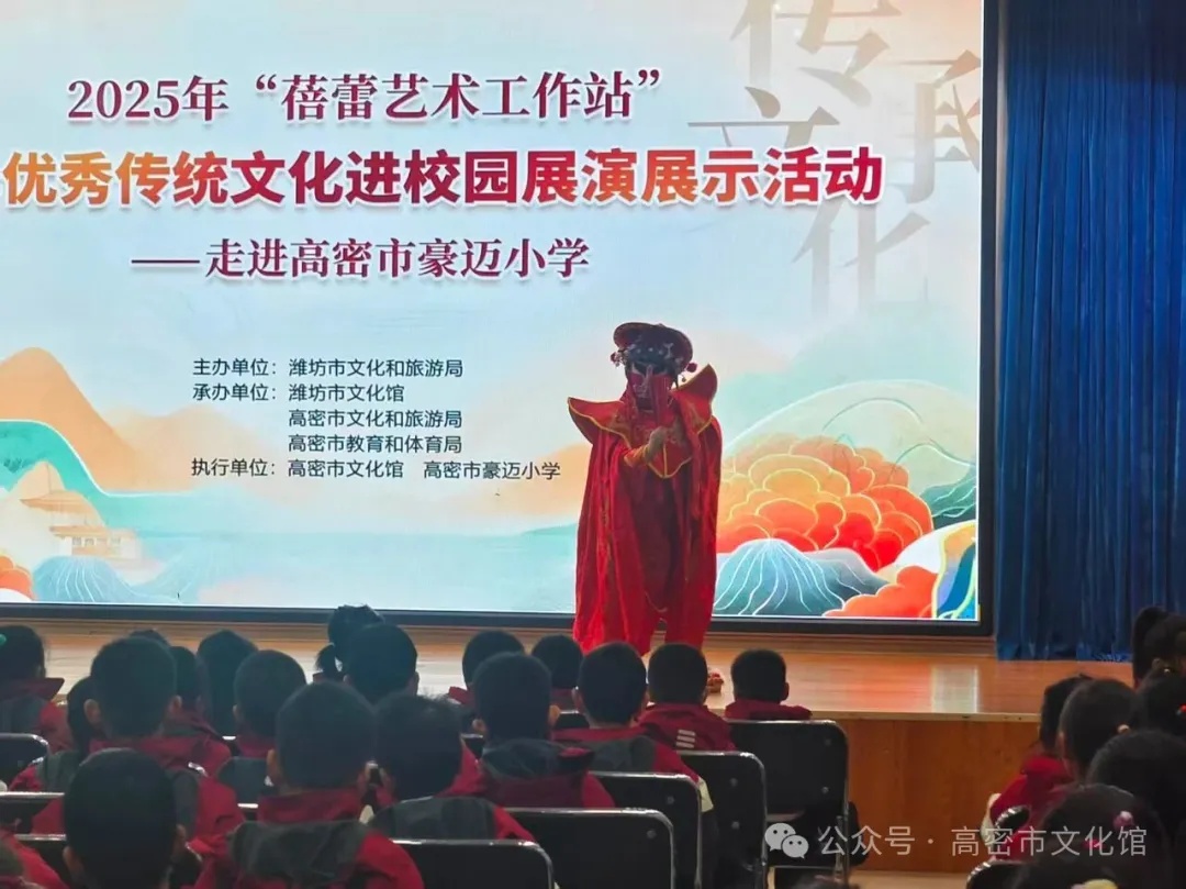 作为高密市“蓓蕾艺术工作站”长效化建设的重要实践,本次活动严格落实省、市关于“文化教育融合发展”“让学生免费欣赏至少1场优秀演出”的要求,也是全市157所“蓓蕾艺术工作站”文化普及工作的生动缩影。活动不仅丰富了豪迈小学师生的课余文化生活,更让同学们在沉浸式体验中触摸传统文化脉搏、感受艺术魅力,在心中播下了文化自信的种子。未来,高密市将持续深化优秀传统文化进校园工作,常态化开展各类特色文化活动,让中华文脉在校园沃土中代代相传,让文化之花在青少年心中持久绽放。