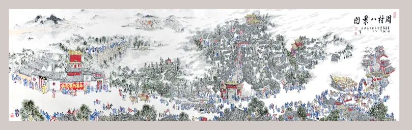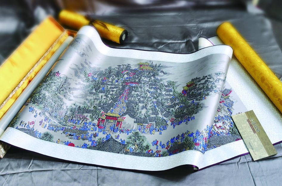 周村丝绸织锦品种类别很多,根据现有的织锦画素材作品的题材内容来看,较大的丝绸织锦画多是风景织锦,风景多以山水及历代名画为主,如《周村八景图》《清明上河图》,还有如《织女朝凤》《八骏图》等绘画作品织锦,《孔子》等人像织锦,另外还有专门定制的实用织锦。