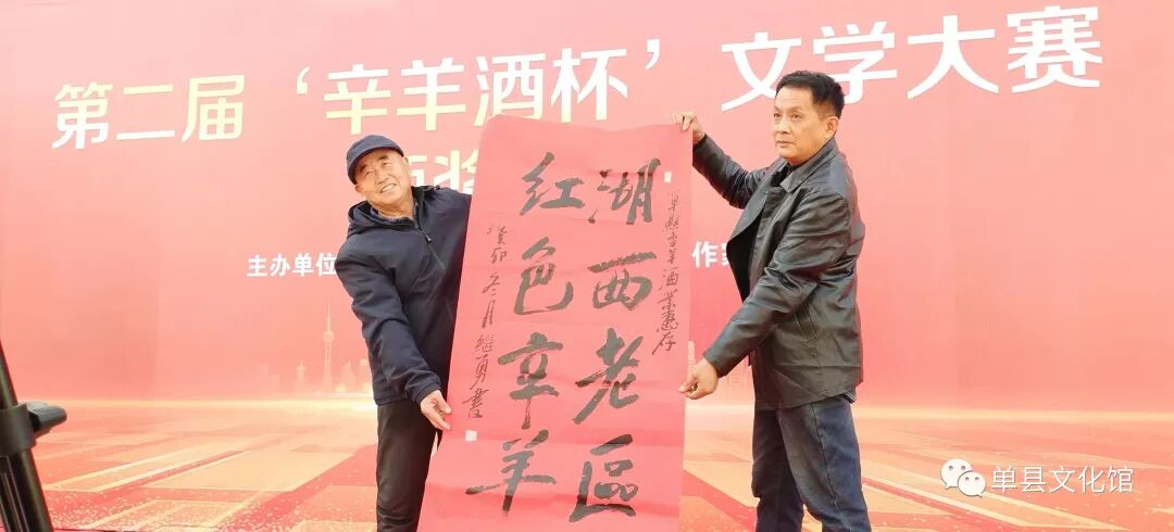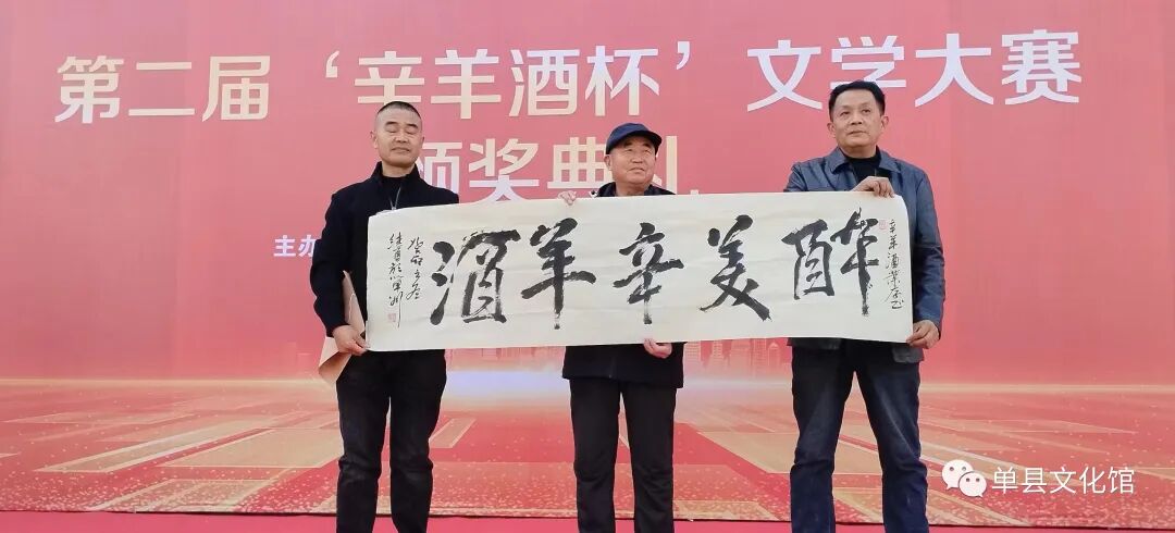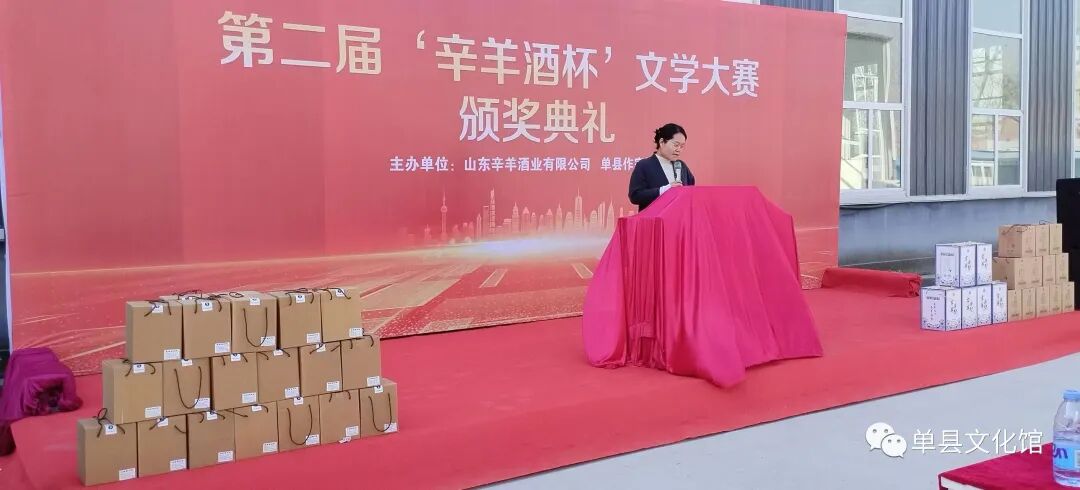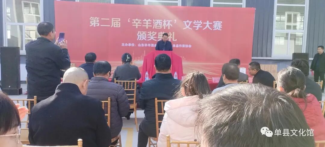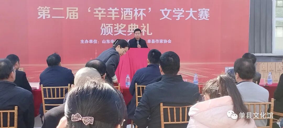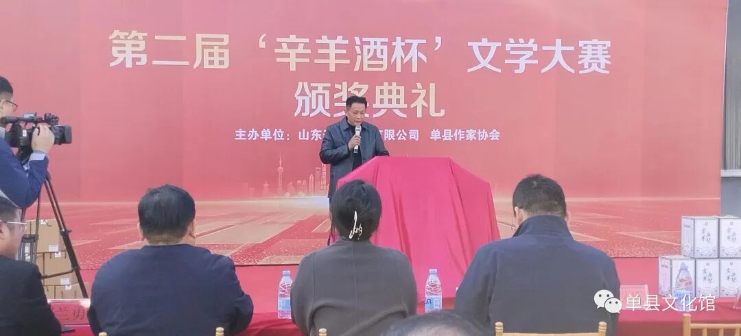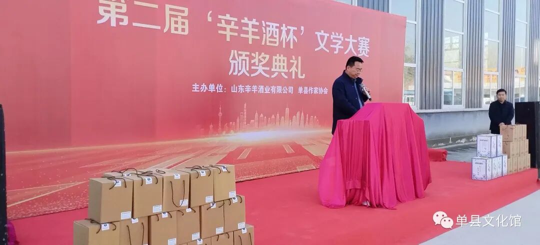山东辛羊酒业有限公司董事长蔡耀宇致辞;单县文联主席张颖宣读获奖名单。
