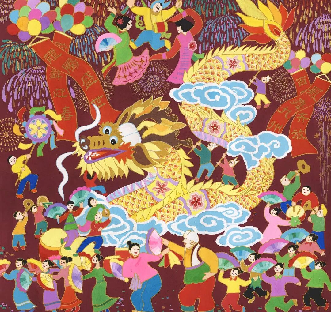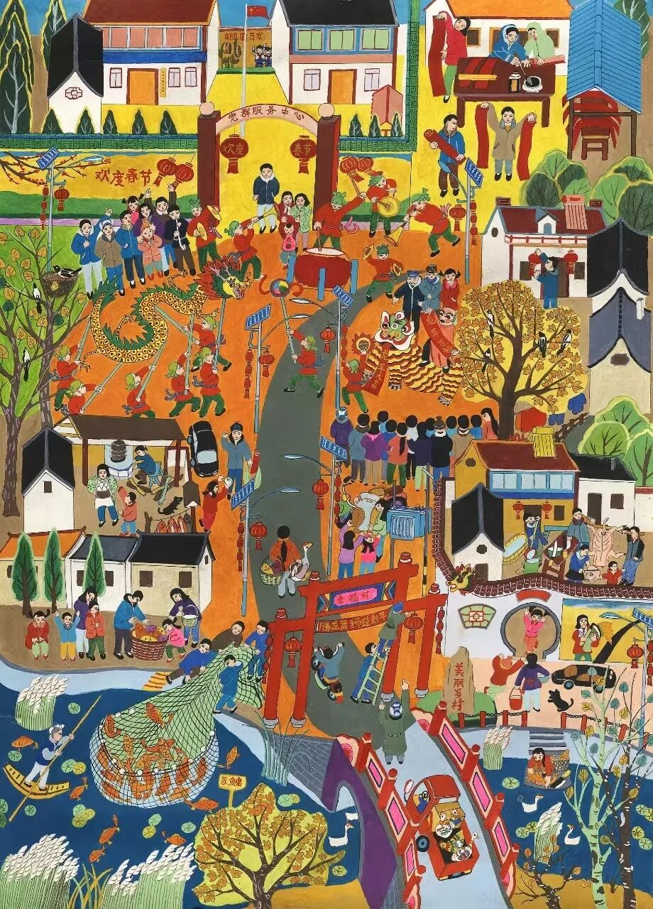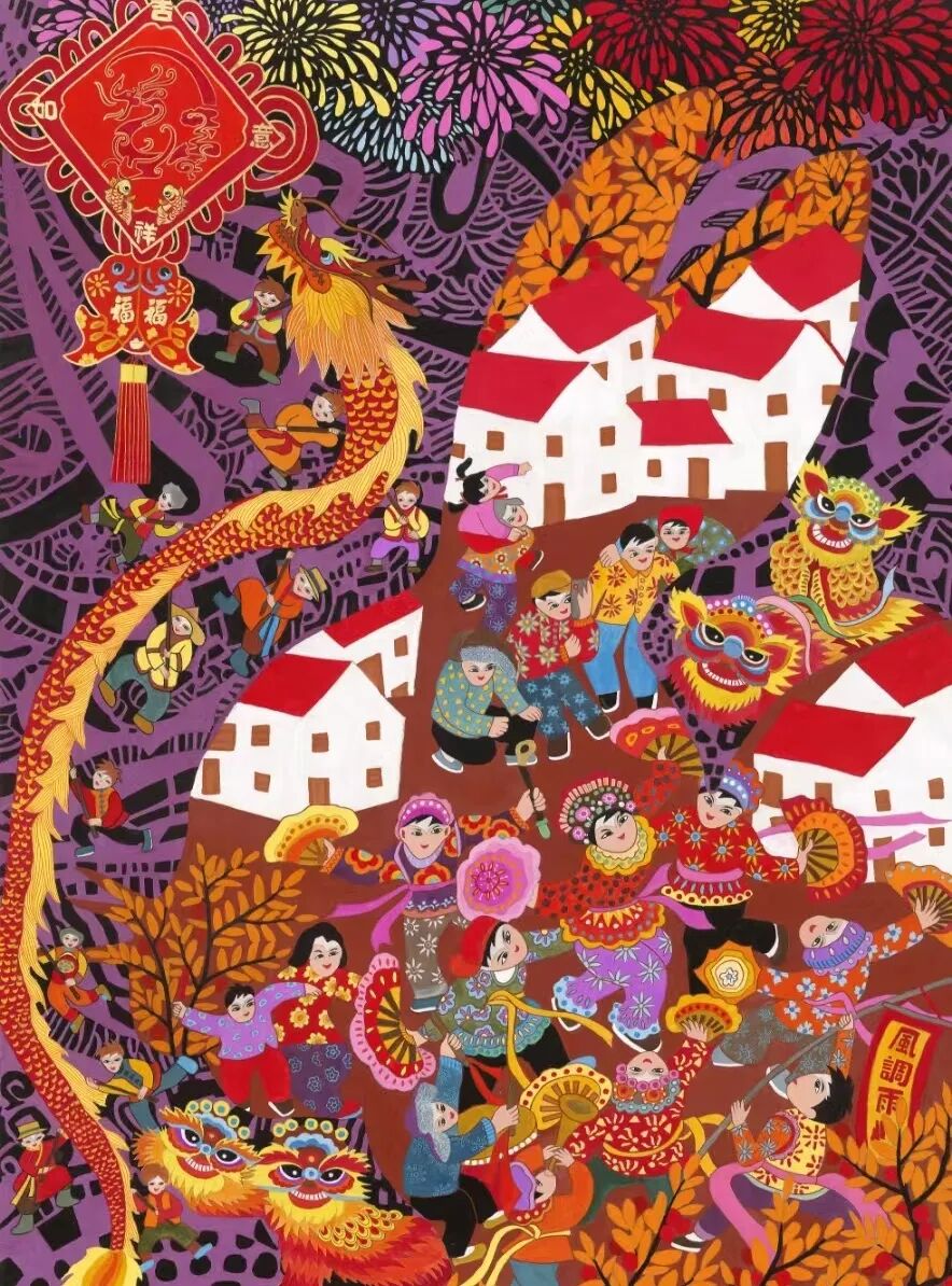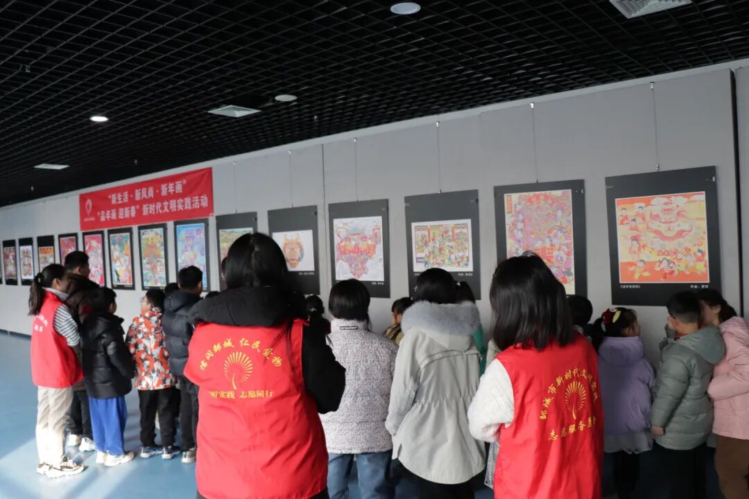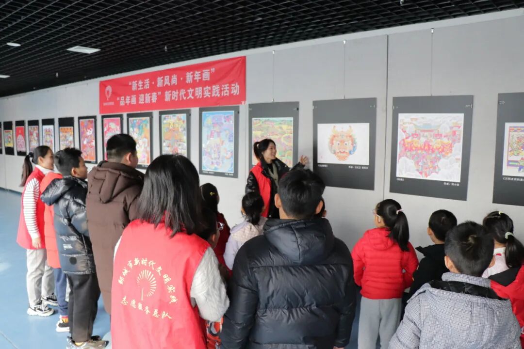 春夏秋冬的丰收场景、街巷市井的热闹生活、大江南北的民俗风情,艺术爱好者们通过木版年画、新年画、农民画以及具有年画元素的插画等多种表现形式,展现出年画中蕴含的中华优秀传统文化魅力。志愿者与孩子们共同欣赏书画,了解书画所呈现的不同主题,引导着孩子们发挥自己的创造力和想象力,以春节为主题,结合龙年“福”文化构想着自己心中的新年图画。