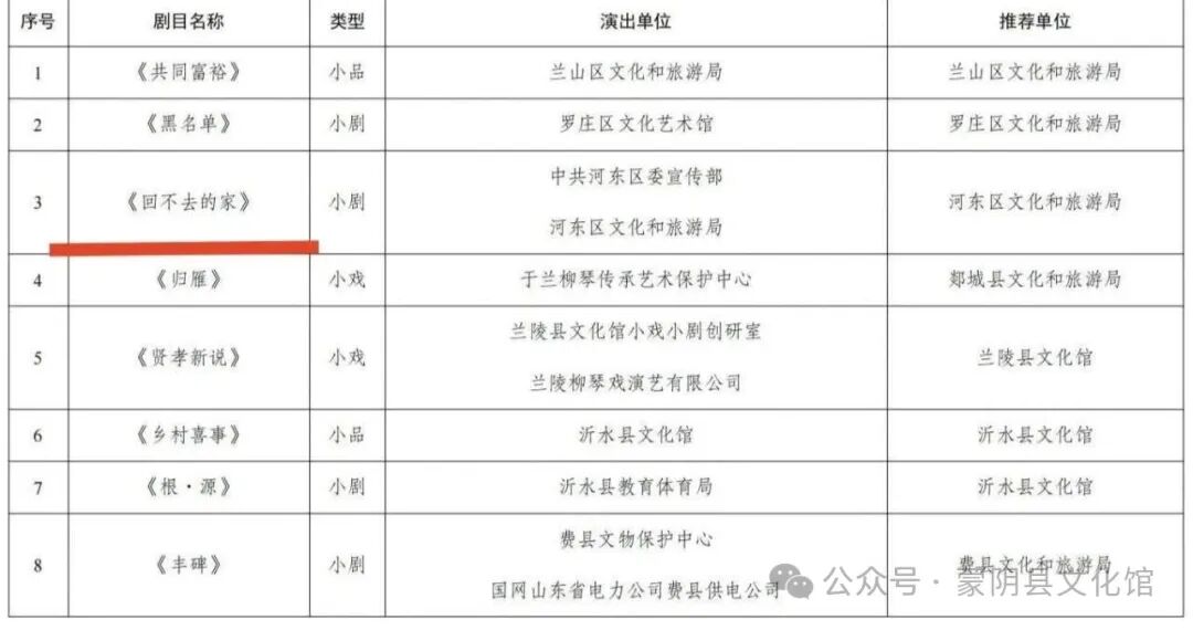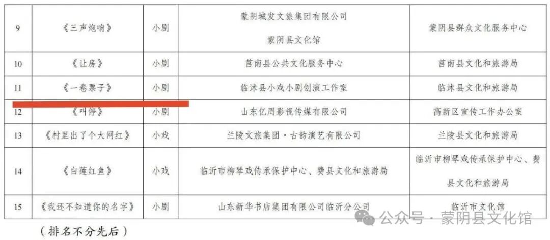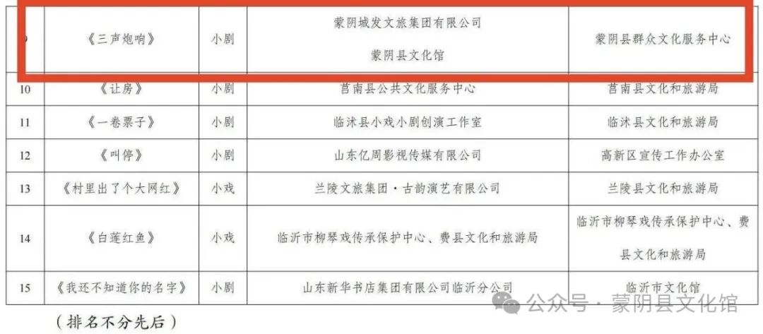 蒙阴县文化馆张新华创作的体现乡村振兴的《三声炮响》荣获优秀剧目奖;蒙阴县文化馆张莉创作反映营商环境的小品《孙建设的心事》、12345首发的小戏《桃司令》荣获优秀剧本奖;创作廉政小品《一卷票子》和《回不去的家》荣获优秀剧目奖。