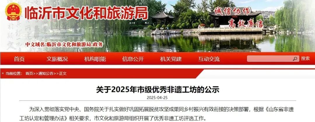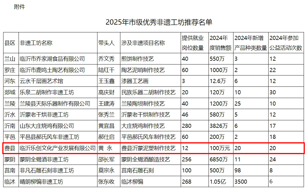 近日,临沂市文化和旅游局公示2025年市级优秀非遗工坊名单,费县非遗工坊临沂乐创文化产业发展有限公司入选。