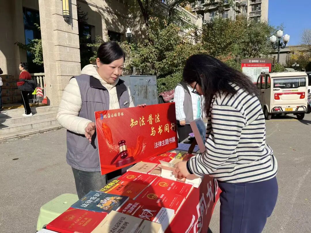 现场还设置了特色手工作品展示区与普法书籍展览区。特色手工作品展示区展出了读者参与槐图文化活动所创作的各类手工作品,精致的手工团扇和形态各异的盘纸作品吸引了众多居民驻足观赏和交流。普法书籍展览区则集中展示了包括民法典在内的多种法律读物,书籍内容丰富且贴近生活,直观地将法律知识传递给基层群众。