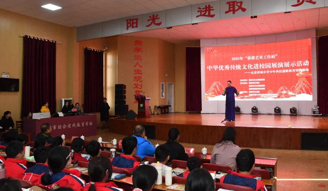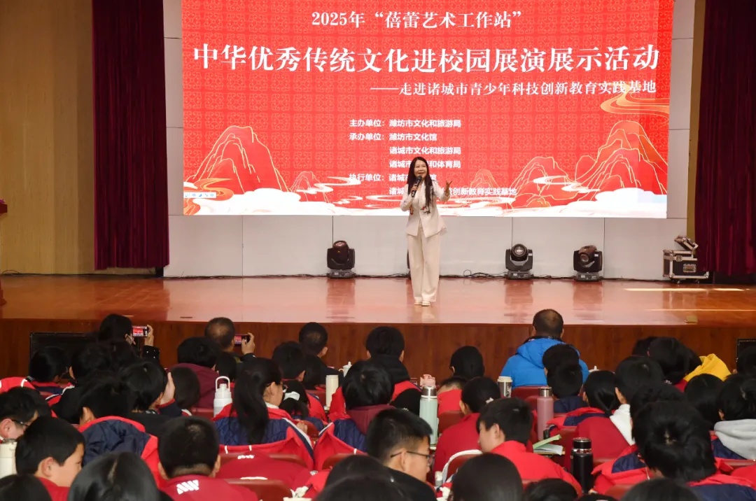 冬日暖阳遍洒校园,艺术蓓蕾悄然绽放。2025年12月4日上午,潍坊诸城市青少年科技创新教育实践基地礼堂内暖意融融、掌声阵阵,2025年“蓓蕾艺术工作站”中华优秀传统文化进校园展演展示活动在此温情启幕。本次活动由潍坊市文化和旅游局主办,潍坊市文化馆、潍坊诸城市文化和旅游局、潍坊诸城市教育和体育局联合承办,潍坊诸城市文化馆与诸城市青少年科技创新教育实践基地共同实施,为现场师生带来了一场浸润心灵的中华优秀传统文化盛宴。